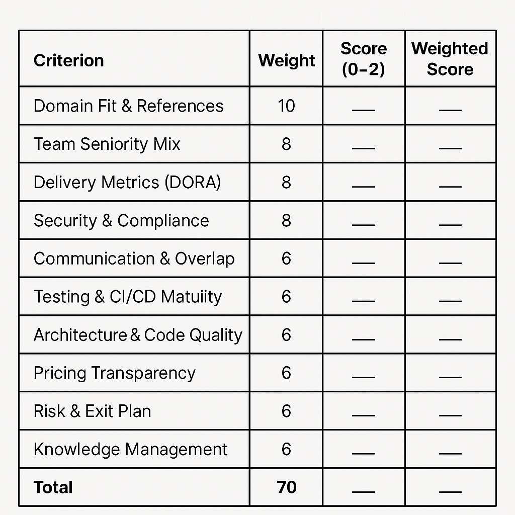 Selecting a software outsourcing partner involves more than comparing quotes or portfolios. To make the process objective and repeatable, use a standardized vendor scorecard like the one below. It helps you measure each provider’s technical capability, governance maturity, and overall fit using consistent, evidence-based criteria.